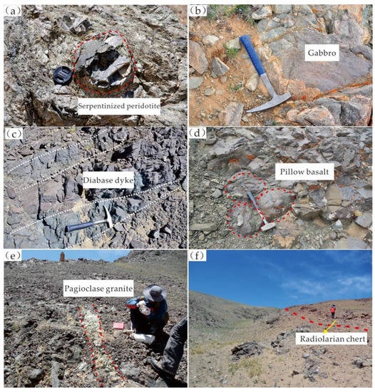 Figure 3. (a–f) Field photographs of the Laguoco ophiolite. (a) Serpentinzed peridotite; (b) Isotropic gabbro; (c) Diabase dyke; (d) Pillow basalt;(e) Plagioclase granite; (f) Overlying radiolarian chert from Laguoco.