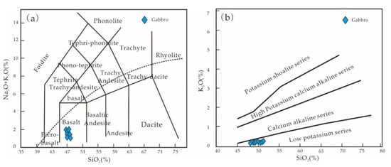 Figure 5. TAS discrimination diagram and rock series of gabbro, Laguoco, Tibet: (a) TAS discrimination diagram of samples modified after [30]; (b) discrimination diagram of rock series modified after [31].