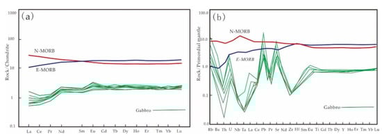Figure 6. (a,b) Chondrite-normalized REE and primitive mantle-normalized trace element distribution patterns for gabbro, Laguoco, Tibet, modified after [33].