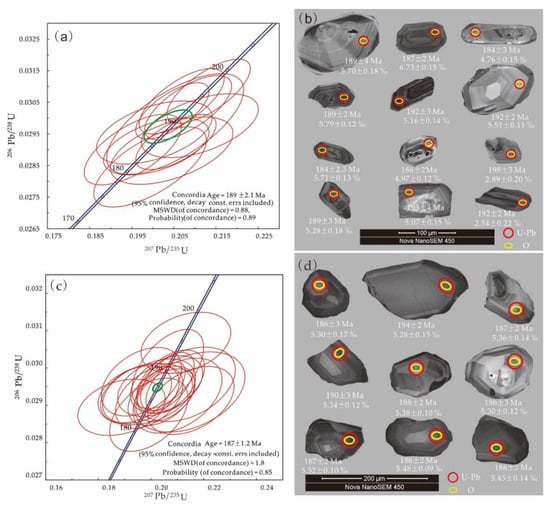Studies have shown that magmatic zircons have large Th/U ratios (generally > 0.4), and, for zircons, Th is directly proportional to U [34,35]. From Table 2, for the 23 test points of sample LGC04, the U content is 369–2093 μg/g; the Th content is 174–792 μg/g; and the Th/U ratio is 0.5–1.4. Th and U values were consistent, indicating a magmatic origin. For the 23 test points of sample LGC04, the zircon Concordia age is 189 ± 2.1 Ma (Figure 7a), denoting the crystallization age of the gabbro. For the 12 test points of sample LGC07, the U content is 365–2285 μg/g; the Th content is 207–2044 μg/g; and the Th/U ratio is 0.4–1.2. Th and U are consistent, indicating a magmatic origin. For the 12 test points of sample LGC07, the zircon Concordia age is 187 ± 1.2 Ma (Figure 7c), denoting the crystallization age of the gabbro.