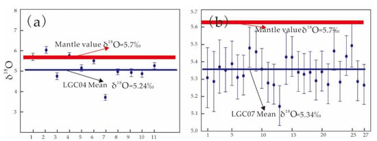 For zircons of gabbro sample LGC04, the δ18O is 2.89‰–6.73‰. Except for test point 2, which has a comparatively high δ18O of 6.73‰, the weighted average of the remaining points is 5.24‰ ± 0.12‰ (Figure 8a), which is the same as mantle δ18O (5.3‰ ± 0.3‰, [34,35]). For zircons of diabase sample LGC07, the δ18O is 5.15‰–5.48‰. The weighted average of all points is 5.34‰ ± 0.12‰ (Figure 8b), which is the same as mantle δ18O (5.3‰ ± 0.3‰, [36]), proposing that this group of zircons originates from mantle-derived crystallization.
