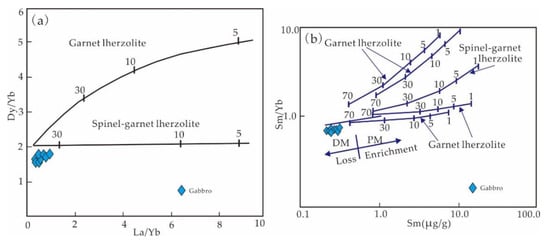 High Sr/Nd ratios are generally attributed to subducted plate fluids, whereas high Th/Yb ratios are attributed to the addition of subduction sediments [41,42]. Gabbro samples in this study had significantly higher Sr/Nd ratios (139 and 214) than the corresponding values for mid-oceanic ridge basalt (12.33, [33]) and upper crust (11.85, [33]). The gabbro is very depleted in Th, Nb, and Ta (the test content of the sample is lower than the detection limit of the instrument<0.05), with the Th/Yb ratio lower than E-MORB (0.25, [33]). Thus, these HFSE ratios indicate exposure to subduction fluids during formation, whereas subduction sediment melts do not play a significant role. The ratios of the inactive elements Dy/Yb, La/Yb, and Sm/Yb to Sm indicate the compositional characteristics of rock sources [39,40,43]. For the gabbro in Laguoco Tso ophiolite, Dy/Yb-La/Yb (Figure 9a), the relatively high Dy/Yb (1.55 on average) and relatively low La/Yb (0.46 on average) indicate that the source originates from a high degree of partially melted, spinel lherzolite mantle. Sm/Yb-Sm (Figure 9b) shows that the source magma originates from the partial melting of spinel lherzolite, both pointing to a depleted source.