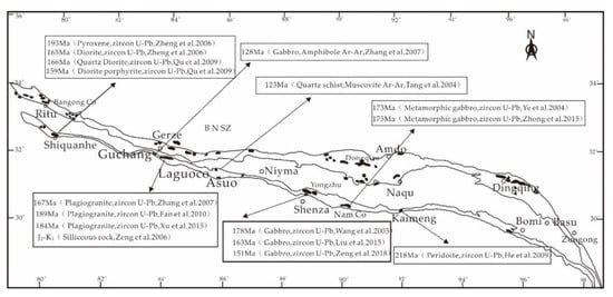 The Shiquanhe–Laguoco–Yongzhu–Jiali ophiolite mélange belt (abbreviated as “SLYJZ”) in the central Tibetan plateau is located in the northern part of the Yarlung– Zangbo suture zone, near the southern part of the Bangong–Nujiang suture zone (Figure 1) [7,8]. The NWW–EW–SE-trending belt starts from the Shiquanhe River in the west and runs southeastward past Guchang, Laguoco, Asuo, Shenzha, Yongzhu, and Kaimeng, over a distance of more than a thousand kilometers with a width of 3km–35 km [6,9,10]. The ophiolite’s petrogenesis in this belt and the associated sedimentary rock formations have been widely investigated since the 1990s [10,11]. Particularly, as geological mapping efforts of the Tibetan plateau roll out, novel insights into the distribution, rock composition, formation age, and tectonic background of the ophiolite are gained. However, the ophiolite’s origin and the tectonic affiliation of this belt remain undetermined, restraining further understanding of critical geological aspects of the Tibetan plateau. The ophiolite’s formation environment (intraplate, oceanic island, forearc/back arc basin, or supra subduction zone), subduction polarity (southward or northward), ocean opening mechanism, and opening/closing time (the oceanic crust began to form in the Late Triassic, subducted in the Early to Middle Jurassic; the oceanic basin remained open until the Early Cretaceous) remains debatable [9,12,13,14,15,16,17,18,19]. Thus, more work is required to define the precise tectonic evolution of the SLYJZ suture zone.