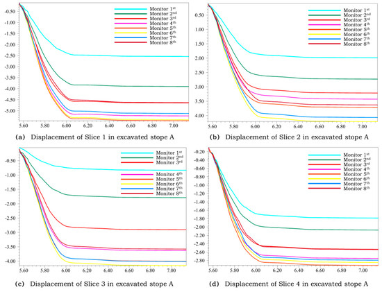 Figure 6b, it can be seen that the horizontal displacement changes in the left- and right-hand side walls of Stope A, showing a gradually increasing trend with the unidirectional changes in the monitoring points. Specifically, the displacements of the right-hand side of Slice 1 and the right-hand side of Slice 3 undergo a change from positive to negative; that is, the monitoring points on the right-hand side shifted from top to bottom, first in the positive direction of the x-axis, and then in the negative direction of the x-axis, while the left side is uniformly displaced in the positive direction of the x-axis, and its overall displacement direction is toward the inside of the stope. The peak is 0.4 cm on the left-hand side of Slice 1. In addition, comparing
