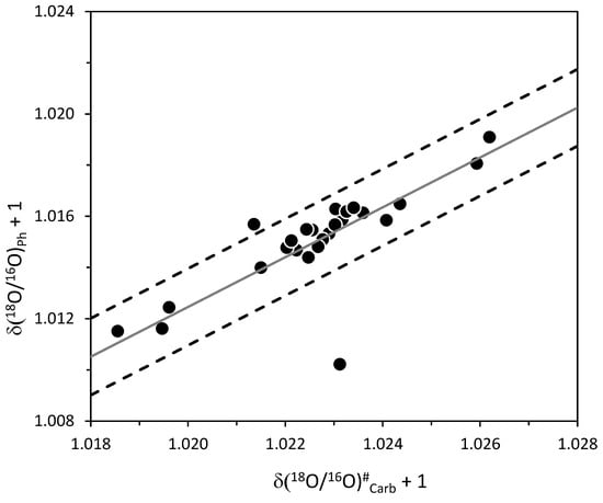 respectively. and are the isotopic values for of low-Mg calcite and bioapatite, respectively, whereas and are values for the produced by dissolution with at a given temperature T. Unfortunately, for most substances the “oxygen isotope phosphoric acid fractionation factor” is not known (this is the case, for instance, for bioapatite). Thus, usually, Equation (A1) is extended to substances different from low-Mg calcite, i.e., in the case of bioapatite: