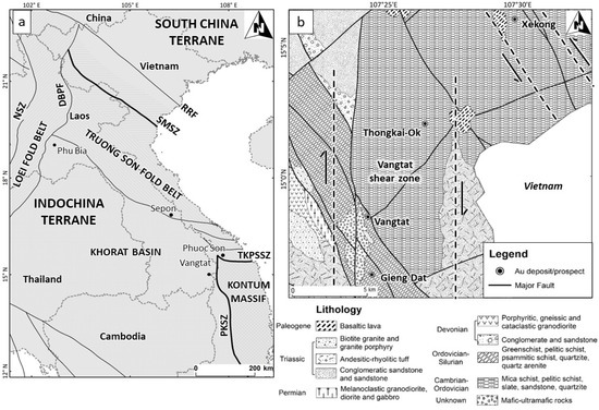 (a) Main tectonic terranes and domains of mainland Southeast Asia, and associated metal deposits (mod. From Lepvrier et al. (2008) [17]). Abbreviations: DBPF: Dien Bien Phu Fault; NSZ: Nan Suture Zone; PKSZ: Poko Suture Zone; RRF: Red River Fault; SMSZ: Song Ma Suture Zone; TKPSSZ: Tam Ky-Phuoc Son Suture Zone. (b) Geological map of the Vangtat shear zone, southeastern Laos, and the distribution of Au deposits (Bounliyong et al. (2021) [9]; after Vilayhack et al. (2008) [18]). The black dashed lines roughly mark the boundaries of the shear zones.