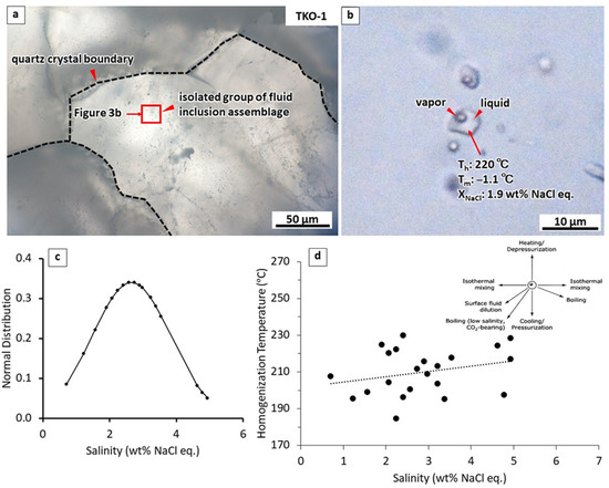 (a) Photomicrographs showing the fluid inclusion assemblages inside quartz crystals from the Thongkai-Ok Au deposit; (b) two-phase liquid-vapor inclusions; (c) graph showing normal distribution of fluid inclusion salinity; (d) correlation diagram of homogenization temperature (Th) vs. salinity, the typical trend in Th-salinity from Wilkinson (2001) [26].