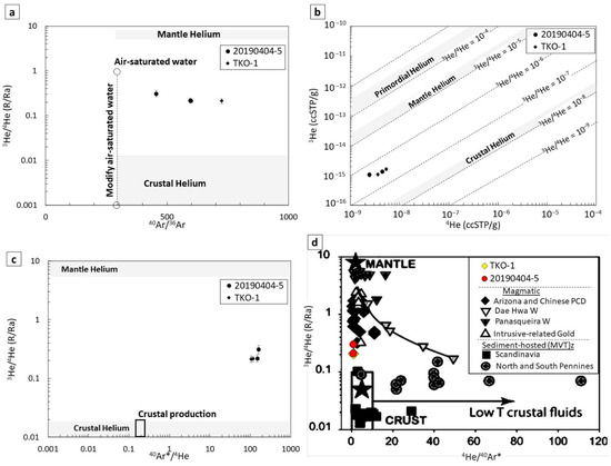 Correlation diagrams of noble gas isotopic composition from fluid inclusions trapped inside quartz separate samples at the Thongkai-Ok Au deposit: (a) plot of 3He/4He (R/Ra) vs. 40Ar/36Ar; (b) He isotopic compositions; (c) 3He/4He vs. 40Ar*/4He. Concentration of 40Ar* compared with the atmospheric 40Ar/36Ar = 296.0 was calculated by 40Ar* = (40Ar/36Ar – 296.0) × 36Ar; (d) Correlation diagram of 3He/4He vs. 4He/40Ar*, comparing the Thongkai-Ok hydrothermal fluid with selected magmatic- and formation water-derived ore fluids (modified from Kendrick and Burnard, 2013) [16]. The stars represent the mean mantle and crustal production ratios, and the rectangle box represents the range of crustal components.