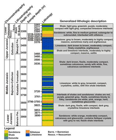 In the Shushan Basin, the stratigraphic succession of the Almaz-1 well comprised of Pre-Cambrian basement rocks, mainly fractured granitic rocks, followed by the Bahrein, Khatatba, Masajid, Alam El Bueib, Alamein Dolomite, Dahab Shale, Kharita, Bahariya, Abu Roash, and Khoman Formations. The current study focuses on the lower stratigraphic succession, represented by the Bahrein, Khatatba, Masajid, and Alam El Bueib Formations (Figure 2). The Lower Jurassic Bahrein Formation is composed of massive light pink to red and yellow colored, coarse-grained continental sandstone intercalated by thin layers of dark grey to red shale [4]. Due to local basement highs, the Bahrein Formation sometimes pinches out against the older Paleozoic rocks as is the case in the Almaz-1 well. The Bahrein Formation is conformably overlain by the Middle Jurassic Khatatba Formation. During the Bajocian–Kimmeridgian, a gradual rise in relative sea level in north Egypt took place and thick alternations between fine clastics and carbonates of the Khatatba and Masajid Formations were deposited. The Khatatba Formation consists of organic matter-rich black to brown shales interbedded with thin layers of white and pink hard sandstones. The middle part of the Khatatba Formation is represented by a thick interval of white to grey oolitic and argillaceous limestones with minor shale interbeds (Figure 2). The depositional paleoenvironment of the Khatatba Formation fluctuated between fluvio-deltaic and shallow marine conditions [5]. The Oxfordian–Kimmeridgian Masajid Formation conformably overlies the Khatatba Formation. It is composed of a thick unit of grey to dark brown limestones, which are usually argillaceous at the base. The Masajid Formation was deposited in shallow marine to shelf basin conditions [4]. The Lower Cretaceous Alam El Bueib Formation rests conformably on the Masajid Formation. It consists of white to yellow sandstones and siltstones with consequent alternations of grey shales and compacted limestones. Carbonate facies are more common in the upper part of the Alam El Bueib Formation. This formation was deposited in a shallow marine shelf environment.