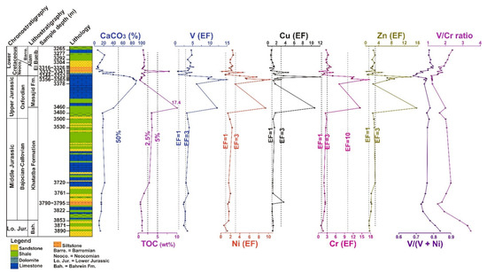 The role of paleo-redox conditions was assessed for the studied Jurassic–Lower Cretaceous interval based on stratigraphic variations in enrichment factors of redox-sensitive trace elements, including V, Ni, Cr, Cu, and Zn (Supplementary Materials Table S1). Additionally, the redox proxy V/(V + Ni) was used to reveal prevalent oxygenation levels during deposition. Generally, the stratigraphic trends in the EFs of V, Ni, Cr, Cu, and Zn are markedly similar to each other and to the TOC profile (Figure 3). The Bahrein Formation at the lower part of the succession is characterized by low values of V, Ni, Cr, Cu, and Zn enrichment factors, which are in the range of 2.1–3.3 (avg. 2.7), 0.7–1.7 (avg. 1.2), 0.8–1.5 (avg. 1.24), 1.1–1.2 (avg. 1.1), and 1–1.2 (avg. 1.1), respectively. The values of the V/(V + Ni) and V/Cr ratios are the highest within the Bahrein Formation and are in the range of 0.75–0.83 and 2.6–4, respectively (Figure 3).