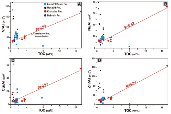 Additionally, Al-normalized redox-sensitive trace elements, including V, Ni, Cu, and Zn were plotted versus TOC content to provide further information on controlling mechanisms of their enrichment and thus deduce a reliable assessment of redox conditions during the depositions of the studied succession (Figure 4A). The high TOC samples of the Khatatba Formation show significant correlations between TE/Al and TOC relationships compared to the TOC-lean Bahrein, Masajid, and Alam El Bueib formations (Figure 4B–D).