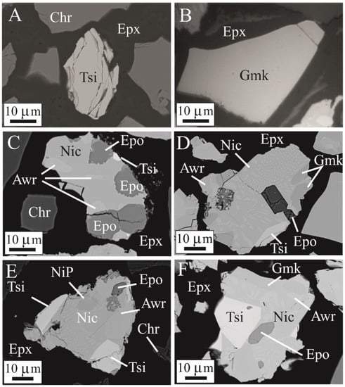 BSE images showing the new minerals found in the Agios Stefanos mine. Single-phase grains of tsikourasite (A) and grammatikopoulosite (B) and composite grains containing tsikourasite, grammatikopoulosite and eliopoulosite (C–F). Symbols: Tsi = tsikourasite, Gmk = grammatikopoulosite, Epo = eliopoulosite, Awr = awaruite, Nic = nickelphosphide, Chr = chromite, Epx = epoxy. Images modified after Zaccarini et al. []; Bindi et al. [,].