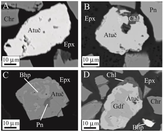 BSE images showing arsenotučekite discovered in the Eretria (Tsangli) chromium mine. Single-phase grains (A,B), and composite grains consist of arsenotučekite, breithauptite, pentlandite and gersdorffite (C,D). Arsenotučekite in contact with chlorite is shown in (B,D). Symbols: Atuč = arsenotučekite, Pn = pentlandite, Bhp = breithauptite, Gdf = gersdorffite, Chr = chromite, Epx = epoxy. The photos (A–C) are taken by Zaccarini et al. [].
