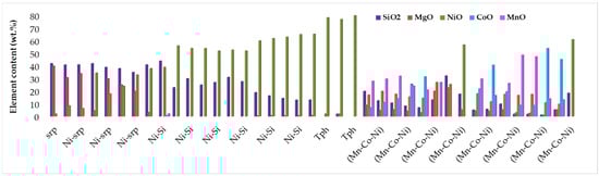 Variation in the SiO2, MgO, NiO, CoO and MnO contents, in serpentine (srp), Ni-serpentine (Ni-srp), Ni-silicides (Ni-Si) and (Mn, Co-Ni)-hydroxides, hosted in metamorphosed Ni-laterite samples from Vermion ophiolite. Symbols: as in Figure 3. Data source: present study and Economou-Eliopoulos and Eliopoulos [].