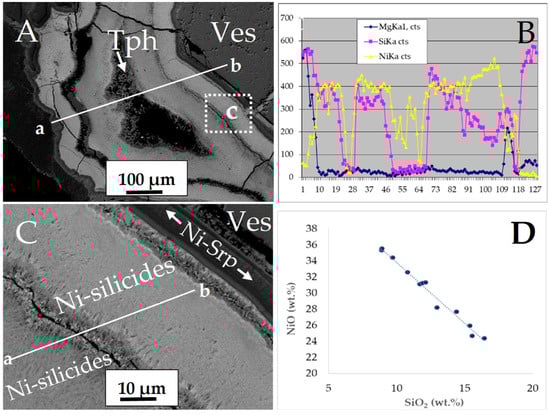 BSE images showing the concentrating development of Ni-silicides and Ni-silicates covering fragmented crystal of vesuvianite (A); scan along a–b of a (BSE)-image showing a wide variation of major elements Si, Ni and Mg, with the presence of Ni only at an early stage of theophrastite precipitation (B); close-up image of silicides (C); plots of NiO versus SiO2 (wt.%) in the compositions of silicides (D). Data source: present work and Economou-Eliopoulos and Eliopoulos [].