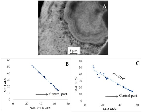 BSE image of (Co-Ni-Mn)-hydroxides showing the concentrating development as successive thin (a few to tens of μm) layers, composed of fine fibrous crystals (A); plots of MnO versus (NiO+CoO) (wt.%) (B) and CoO (wt.%) (C), exhibiting a wide compositional variation, with increasing MnO content outward and maximum CoO content at the central parts (C). Data source: present work and Economou-Eliopoulos and Eliopoulos [].