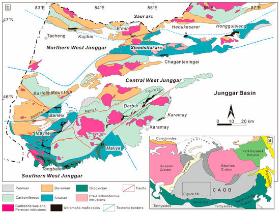 (a) Tectonic framework of Central Asian Orogenic Belt (CAOB) (modified from [27]); (b) simplified geological map showing geotectonic divisions of West Junggar Orogen (modified from [28]).
