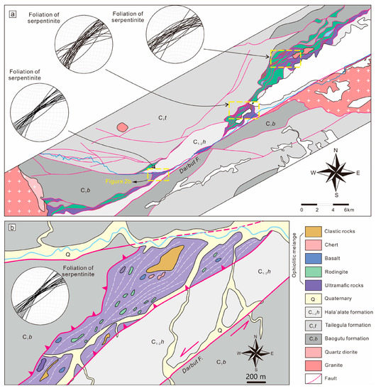 (a) Geological map of Darbut ophiolitic mélange (modified from [23]); (b) geological map showing structural relationships of western segment of Darbut ophiolitic mélange. For regional location, see Figure 1. Stereographic projections of structural data represent foliations in serpentines.