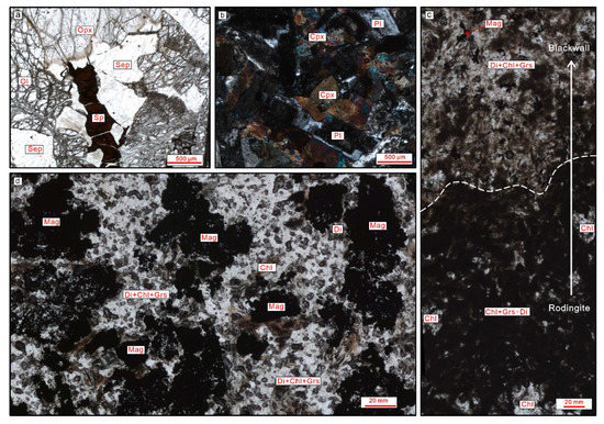 After completing the geological mapping, a suite of samples representing different lithologic units identified in the field was collected for petrographic analyses, including serpentinized peridotite, fresh gabbro, rodingite, and blackwall. Peridotites have suffered variable degrees of serpentinization, which can be observed at the outcrop, handsample, and thin-section scales. They are mostly harzburgite with minor amounts of lherzolite and dunite [24,49,50]. Serpentinized peridotite is composed of serpentine, olivine, orthopyroxene, clinopyroxene, and chrome-spinel (Figure 4a). Olivines display a typical mesh texture and are enclosed by serpentinite and opaque minerals. Chrome-spinels usually occur as isolated and highly fractured grains. Gabbros usually experienced greenschist-facies metamorphism. They locally preserve relict subophitic and ophitic textures at the handsample scale and mainly consist of coarse-grained pyroxene and plagioclase (Figure 4b), with minor chlorite and epidote. Plagioclase usually occurs as tabular subhedral to euhedral laths. Clinopyroxene is subhedral to anhedral in shape and replaced by amphibole in some cases. Secondary minerals mainly comprise chlorite, epidote, and prehnite. Rodingites usually exhibit fine-grained porphyritic to aphanitic textures; they generally consist of grossular, diopside, chlorite, and titanite (Figure 4c,d); and some samples contain relict magmatic minerals, including plagioclase and clinopyroxene. Accessory minerals mainly include apatite, magnetite, and ilmenite. Grossular and diopside generally occur as cloudy aggregates of anhedral. Blackwalls are dominated by chlorite; grossular, diopside, and magnetite often present in the form of fine-grained aggregates of anhedral with the chloritic matrix (Figure 4c,d).