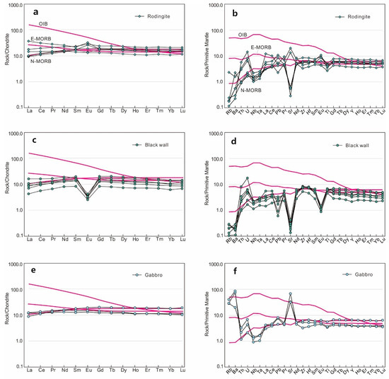 The isocon line for rodingites has a lope of 1.15, indicating an average mass loss of about 13%. Most major elements in rodingites were variably mobile (Figure 6a). There were slight increases in Mn and strong increases in Ca, whereas total alkalis (Na, K) and Si were obviously depleted. Fe, Mg, and P plot near the isocon line, which implies insignificant modification. Regarding the trace elements (Figure 6c), REEs, HFSEs (e.g., Nb, Ta, Th, U, and Hf), and V appear to be relatively immobile since they plot very close to the isocon line. In contrast, most LILEs (e.g., Rb, Ba, Sr, and Pb) were extracted from the protolith during rodingitization. The isocon line for the blackwall has a lope of 1.78, indicating an average mass loss of about 44%. CaO, total alkalis (Na, K), and Si contents have been significantly depleted; Al, P, and Fe are also slightly decreased; while MgO and MnO are highly enriched (Figure 6d). For the trace elements (Figure 6e,f), HFSEs (e.g., Nb, Ta, Th, U, Hf) and V are relatively immobile; LILEs (e.g., Rb, Ba, Sr, and Pb) and REEs, especially Eu, display clear depletion.