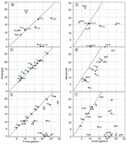 Isocon analysis has been widely used to determine chemical gains and losses during mass transfer (e.g., [10,18]). According to [53], the immobile elements should lie on a straight line (isocon), and the slope of the isocon represents the overall change in mass relative to protolith. Elements plotting above the immobility isocon are added into the rock during mineralization and alteration. Elements plotting below the immobility isocon are removed from the rock. In this study, we relatively compared rodingites and blackwalls with fresh gabbros using this method to estimate the compositional variations. Al, Zr, and Ti are usually considered as immobile elements during metasomatism [54]. In this study, Zr and Ti were utilized to generate immobility isocon because of their high positive correlations among each other.