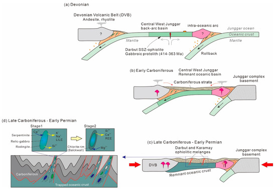 Finally, we attempted here to reconstruct the process of formation and evolution of the Darbut rodingite. In the Devonian, slab rollback of the Junggar Ocean formed a back-arc basin in the central West Junggar area, forming the SSZ-type Darbut ophiolite [26,36] (Figure 8a). In this setting, the gabbroic protoliths of rodingites were derived from a depleted mantle source that had been metasomatized by slab-derived fluids. The back-arc oceanic basin began to shrink and progressively evolved into a remnant oceanic basin in response to the successive bending of the Kazakhstan Orocline in the Early Carboniferous [23,30,32,69], and numerous volcaniclastic and tuffaceous materials derived from the Carboniferous arc-related rocks were quickly deposited in the remnant basin (Figure 8b). Regional convergence of the southwestern Altaids in the Late Carboniferous led to the extensive deformation in the central West Junggar area and to the tectonic extrusion of the Darbut ophiolitic mélange accompanied by strong dismemberment and shearing of the previous SSZ-type ophiolite (Figure 8c) [23]. In this stage, the diapiric emplacement of the Darbut ophiolitic mélange also resulted in the extensive serpentinization of ultramafic rocks, inducing the intensive rodingitization of gabbro blocks (Figure 8d). In the Early Permian, postcollision volcanism likely released a mass of metasomatic fluids with a high water–rock ratio and high CO2 content [49,68], resulting in the derodingitization of rodingites (Figure 8d).
