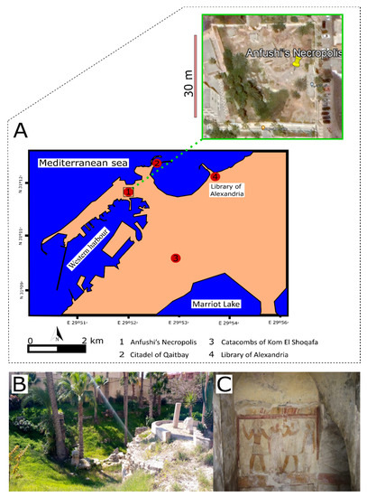 (A) The geographical location of Anfushi’s Necropolis on the coast of the Mediterranean Sea. (B) The general view and the current state of preservation of Anfushi’s Necropolis. (C) Ancient Egyptian-style scene.
