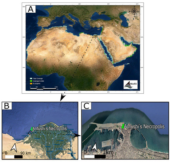 (A) General map of the endangered coastal archaeological sites in North Africa and the Middle East. From [17]. (B) Zoomed-in risk map of the delta (including Alexandria), and the green pin shows the case study of Anfushi’s Necropolis as an endangered coastal archaeological site in North Africa, Egypt (Alexandria). (C) Zoomed-in map of endangered Anfushi’s Necropolis and its surrounding coastal environment.