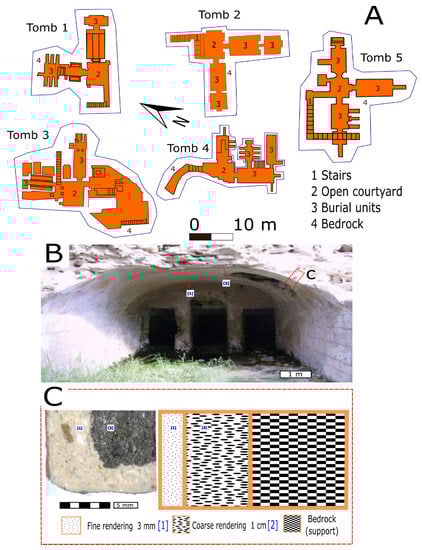 (A) Schematic plans for the five tombs of Anfushi’s Necropolis and their architectural elements of the rock-cut tombs and their elements. (B) General view the ground level of the tomb No 4 leads to the burial units and attached rooms. Numbers in square brackets and red rectangles refer to the image (C). (C) Cross-section for mortar of the tombs, which consists of the support wall (bedrock), coarse rendering mortar, and fine rendering mortar for painting.