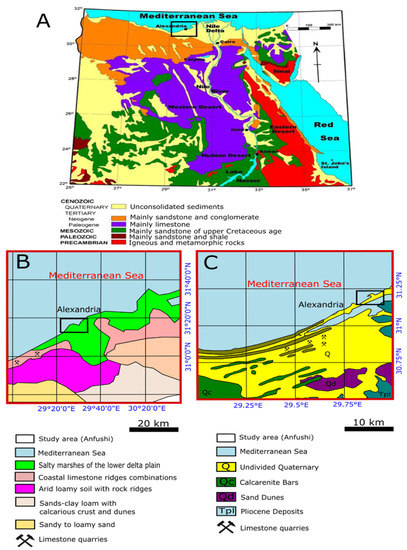 (A) Geological map of Egypt (black rectangle refers to Alexandria) from [39]. Detailed maps for soil units (B) and geological map (C) of Alexandria, edited after [43]. Black rectangles refer to the study area.