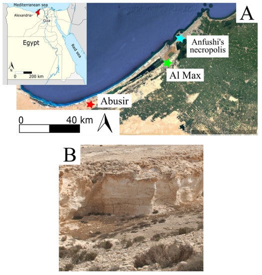Ancient Egyptians used different kinds of stones (limestone, sandstone, granite, basalt, etc.) from different quarries along Egypt, from south to north and from east to west. The extracted stone blocks were used to build temples and tombs in different periods in Egypt for architectural and ornamental purposes [47,48,49]. Alexandria was a source of quarried limestone blocks from the Quaternary ages along the Nile delta’s Mediterranean coast [50]. Abusir and Al Max west of Alexandria are considered quarries that were used from the Ptolemaic era to the Roman era (Figure 5). The limestone of these quarries is light-coloured, and their deposits belong to the Pleistocene Alexandria Formation. Ancient and recent quarries are observed on the Alexandria-Marsa Matrouh Road in a 21 km area [51,52].