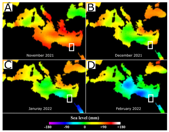 (A–D) Satellite images for the average monthly sea level rise variations; the pinkish rectangle refers to Alexandria. From https://climate.nasa.gov/, accessed on 13 May 2022.