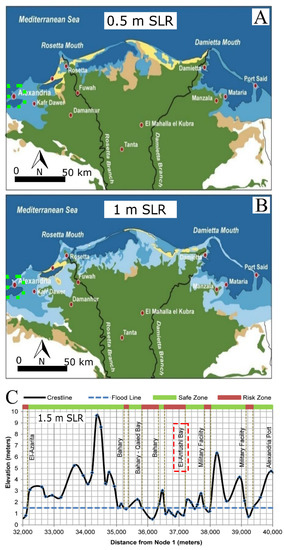 (A,B) Two scenarios for possible water increases of 0.5 m and 1 m, respectively, and their impact on territory. Alexandria and the research area are represented in the green dotted square, after [29]. (C) Longitudinal profile of the flood line and safe and risk zones for the SLR scenario of 1.5 m. The study area is represented in black rectangle as a risk zone, after [28].