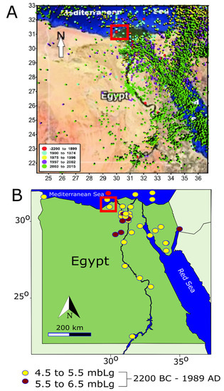 (A) General distribution of the historical record of earthquakes in Egypt (2200 BC to 2015 AD). (B) Map of historical earthquakes with their magnitudes from 2200 BC to 1989 AD, after [61]. Red squares represent the Alexandria area.