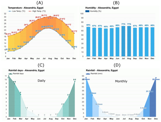 (A–D) Hyetographs for meteorological average data in Alexandria 2021 of temperature ((A), in °C), relative humidity ((B), in %), rainfall days ((C), in number of days) and rainfall ((D), in mm). After https://www.weather-atlas.com/en/egypt/alexandria-climate. Accessed on 19 May 2022.