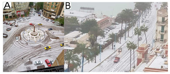 Alexandria is considered warm, arid, and clear in the summer, but it is cool, rainy, and windy in the winter. In the summer, the average temperature degree is above 30 °C from June to the end of September. On the other hand, the temperature in the winter is a 5 °C minimum and 18 °C maximum from December to mid-March (Figure 9A) [72]. From the automated weather station at the western harbour (approximately 1 km from Anfushi’s Necropolis), the maximum relative humidity from 2007 to 2018 was 99%, and the minimum relative humidity was 11% [73]. In 2021, the maximum relative humidity was 71%, and the minimum relative humidity was 65% (Figure 9B). Furthermore, the average rainfall in the summer is approximately 30 mm, while the average rainfall in the winter is 166 mm [68]. Hafez [72] said that the average annual rainfall is approximately 200 mm but can reach more than 400 mm. Figure 9C shows the average days of rainfall in Alexandria, and Figure 9D shows the monthly average rainfall in Alexandria in 2021. Due to rapid climatic change, Alexandria has only two seasons: a hot summer from April to September and a moderate winter from October to March. Daytime temperature and wind patterns are the main factors for the difference between the two seasons [74]. In 2021, the maximum wind speed was 44 km/h or 24 kts (strong), and the minimum speed was 7 km/h or 3.78 kts (weak). Wind forces represent 70% of the total dynamic in both sea level, and current and tidal actions represent 30% of the sea level and its current energy (Table 2) [75]. Currently, snow is part of the marine dynamics in Alexandria that affect ancient building materials. After decades, Alexandria was subjected to snowfall in December 2021, and this was considered a rare snow occurrence (Figure 10A,B). However, from time to time, Egypt experiences a cold snap, with low temperatures reaching 2 °C. Bibliographical studies of snowfalls in Egypt and Alexandria are not available; however, it said that Egypt experienced snowfalls in 1639, 1855, and 1934.