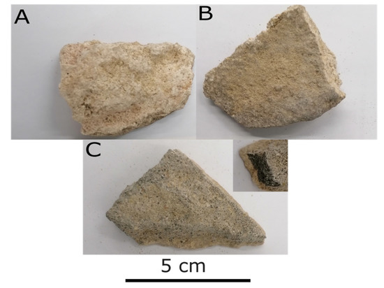 Highly weathered fallen archaeological samples were collected from the different parts of Anfushi’s Necropolis (construction materials and rendering mortars) to carry out the assessment study of the decay through analysis and microscopic examination from the construction. Samples of the construction materials were divided into samples from the casing stone and the bedrock with light colour and crust over the surface (Figure 11A,B). The rendering mortar samples were coarse and fine mortars from the first and second layers with blackish and yellowish colours, respectively (Figure 11C). The samples ranged from 3 cm to 7 cm3 in size. In addition, some of the samples had been ground to be ready for analysis purposes.