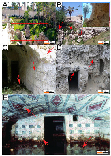 (A,B) Structural damage aspects due to earthquakes. (A) The red rectangle refers to the deformations in the structures. (B) The red arrows refer to collapse and displacement of the blocks and opened joints, and the red square refers to the damage to walls with chipping. (C) Water intrusion impact on the architectural and structural elements of Anfushi’s Necropolis. Red arrows refer to biological growth, salt accumulation, and degradation of the stone and painting layers. (D) Geotechnical problems and unconsolidated bedrock with many cavities, as shown by the red arrows. (E) Dampness impact over the structural and decorative elements of tomb No 5 (burial unit) at Anfushi’s Necropolis. Red arrows refer to flaking, salt erosion, and biological attack on the tomb’s construction materials [77].