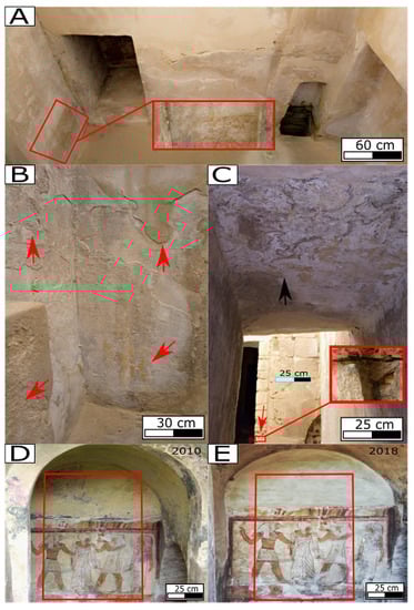 (A–C) Different kinds of decay patterns due to the marine environment the walls are in. (A) The red rectangle refers to areas with efflorescence, subflorescence, edge eroding, flaking, and loss of the painting layer in the courtyard of tomb No 4. (B) The red arrows refer to flaking, exfoliation, salt erosion, surface disintegration, and loss of the painting layer in the courtyard of tomb No 4. (C) Red squares refer to honeycomb and loss of material decay patterns, and black arrows refer to salt precipitation and loss of the painting layer in the corridor to the burial units of tomb No 4. (D) A ritual scene in the necropolis and its state of preservation state in 2010 from tomb No. 2 (back wall of the burial chamber) (from https://mapsus.net/EG/necropolis-of-anfushi-5577, accessed on 1 June 2022). (E) The same ritual scene after 8 years, with a worsened state of preservation, where a large loss of the painting layer and renderings occurred due to the salt attack (from https://www.meretsegerbooks.com/gallery/581/anfushi-necropolis, accessed on 1 June 2022).