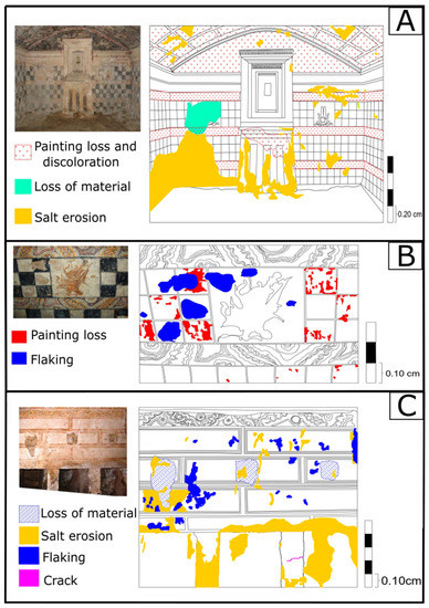 Moreover, many aspects of decay were recorded, such as alveolarization, exfoliation, flaking, salt erosion (efflorescence and subflorescence), discolouration, blistering, spalling and cracking. In this sense, Figure 13A shows the severe state of preservation due to the degradation that occurs in the side room for one of the tombs of Anfushi’s Necropolis. In that room, the degradation aspects are efflorescence and subflorescence, discolouration, blistering, eroded edges, chipping, paint layer removal, and cracking. In addition, we can see the horizontal displacement and cracking on the front wall from approximately 2 to 5 mm. In Figure 13B, the main degradation aspects include exfoliation, flaking, peeling, spalling, blistering, pitting, rising damps, subflorescence, discolouration, and loss of the painting layer. In addition, Figure 13C shows the alveolarization, chipping, and pitting decay forms in the front of the wall, but on the ceiling, the main degradation patterns are efflorescence and subflorescence, discolouration, and paint layer removal. Figure 13D,E show two historical photos that date back to 2010 and 2018 for the same area, respectively, where Figure 13D shows a complete ritual scene with its painting layer in a good state. On the other hand, Figure 13E shows the same scene after the loss of most of the painting layers and salt attachment due to marine conditions. In both photos of Figure 13D,E show a displacement of the wall can be observed (out of plane) above the Egyptian-style scene which was estimated by approximately 10 mm. Finally, after taking different photographs, digital recordings were taken to monitor and evaluate the deterioration patterns in different areas for different architectural elements of Anfushi’s Necropolis, showing that salt erosion, the loss of materials, the loss of painting layers, flaking, and cracks are the most dominant decay aspects over the surfaces (Figure 14A–C).