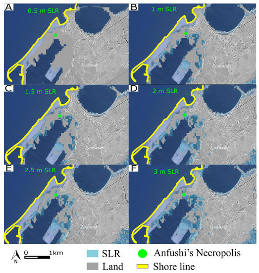 Currently, SLR is considered the main hazard for the archaeological sites in Alexandria. Accordingly, the probabilistic analysis and assessment of the future impacts of SLR were carried out through satellite image observations from the accessible Climatic Central Analysis (CCA) (http://sealevel.climatecentral.org, accessed on 10 June 2022). Different topographical scenarios with an SLR ranging between 0.5 and 3 m were evaluated. The results showed that the morphological scenario of 0.5 m SLR would not cover Anfushi’s Necropolis with water (Figure 15A), but the 1 to 3 m SLR scenarios would submerge it completely (Figure 15B–F).