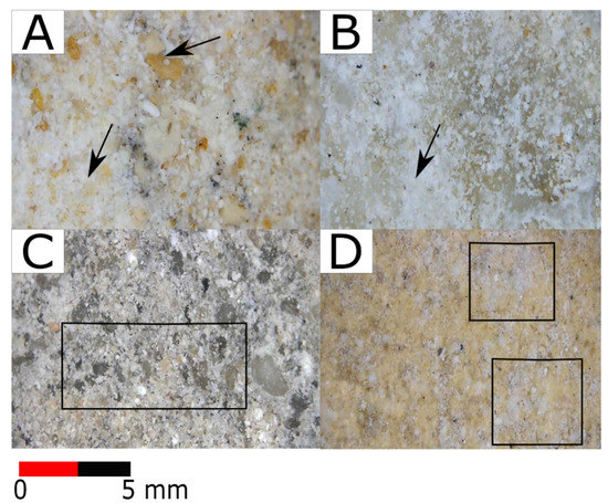 Binocular microscopy was used to examine the textural and morphological features, detecting the alterations and weathering aspects on the surfaces due to the marine environment impact. Figure 17 represents the BR sample, where salt attack (efflorescence) is well observed on the surface and disintegration of the stone surface is seen. Figure 17B shows the morphological texture of the CS, and salt erosion is considered the main feature of decay for the stone surface. Furthermore, Figure 17C represents the coarse-grained rendering mortar, where quartz grains are well shown with different sizes in the lime matrix. Disintegrated quartz grains and some gaps are detected. Figure 17D shows a homogenous surface of the fine-grained rendering mortar and yellowish colour due to the high amount of lime with a minor amount of gypsum. In addition, there are a few quartz grains in the matrix. From textural observations, salt covers most of the mortar surface.