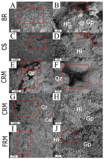 Micromorphological features of the construction building materials of Anfushi’s Necropolis. (A,B) The oolitic limestone (BR, bedrock) surface texture with halite cubic crystals and needle-like gypsum. (C,D) The fossiliferous micritic limestone (CS, casing stone) morphological texture with halite crystal perceptions, pores and microfissures. (E–H) The coarse-grained rendering mortar (CRM) textural features with disintegrated grains, precipitation of halite (cubes), gypsum (needles), and detection of gaps and pitting. (I,J) Fine-grained rendering mortar (FRM) textural aspects with depositing halite mixed with needle-like crystals of gypsum, in addition to gaps and pitting. Red squares and rectangles refer to the disintegration feature of the samples due to salt weathering impact. Scales are expressed in microns. BR: bedrock; CS casting stone; CRM: coarse-grained rendering mortar; FRM: fine-grained rendering mortar; Hl: halite; Cal: calcite; Qz: quartz; Gp: gypsum.