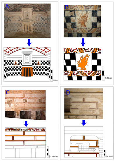 The heritage digitalization approach is considered a reproduction of physical interactions and interventions. Remote recontextualization and interactive models for heritage are necessary since the world of conservation and restoration should follow up all advanced technologies to help protect world heritage. Indeed, the virtual recording and mapping of monuments will decrease the physical interventions to the monuments and increase their authenticity and value [78]. In addition, using computer mapping methods can reduce the mistakes of intervention by restorers, which will help save money for the budgets of restoration projects [79]. In this regard, mapping of the architectural and structural elements was carried out to preserve the archaeological site of Anfushi’s Necropolis using AutoCad 2020. The process is important for virtual archiving to protect our heritage for the next generation, and some maps were made for virtual retouching with the original tones of colours of the paintings and the significant motifs of Anfushi’s Necropolis, and this will help in future restoration work. Geometrical surveys, documentation, data processing, interpretation, the creation of 2D models/maps, editing, and rendering were taken into consideration in the work during the digital restoration, as shown in Figure 20A–D.