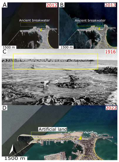 Furthermore, Alexandria is also vulnerable to SLR because of its low elevation and local land subsidence. The land approximately 50 km in front of the sea is less than 2 m from the sea’s water level, and a sand belt formed by sediments charged from Nile branches protects this land with its buildings. After building a high dam, the discharge of these sediments decreased, and the safe sand belt started to be eroded [55]. El-Raey and RCDRR [29] studied two scenarios of SLR’s impact on the loss of land and socioeconomic activities in Alexandria and the whole delta after [56,57]. In this regard, they proposed that an SLR of 0.5 m would affect 3.8 million people and 1800 km2 of land, while it was assumed that an increase of a 1.0 m SLR would influence 6.1 million people and 4500 km2 of land use (Figure 7A,B). Another scenario has been studied with a 1.5 m SLR, which put Anfushi Bay (approximately 300 m from Anfushi’s Necropolis) in the risk zone of the future SLR (Figure 7C) [28].