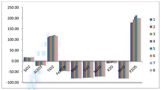 Enrichment in SiO2 may be correlated with the silicification processes, as indicated from petrographic studies [], and can be due to the considerable quantity of free Si-bearing mineral phases (e.g., quartz) that increase in the more evolved granites. The silicification process leads to silica enrichment at the expense of other major oxides. The formation of titanite, rutile, and ilmenite is reflected by increased TiO2 contents in all of the altered granite samples’ alteration of silicate minerals (feldspars and ferromagnesians) and formation of Ti-bearing minerals. Enhanced values of P2O5 could be connected to the presence of apatite, monazite, and xenotime [].