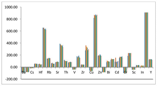 The presence of enrichment-depletion trends for minor elements (Figure 4) is due to the variations of the physico–chemical conditions of the fluids, such as the pH, Eh, temperature, and ionic complexes during the development of this deposit []. Abundances of trace elements in the hydrothermally altered granite samples are either higher (Ga, Hf, Nb, Rb, Sn, Sr, Ta, Th, W, Zr, Mo, Pb, Zn, Bi, As, Cd, Sb, Be, Li, In, Re, Y, U, and Ag) or lower (Ba, Co, Cs, V, Cu, Ni, Cr, and Sc) than those in the upper continental crust.