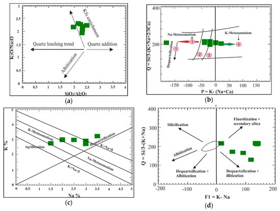 According to the K2O/Na2O versus SiO2/Al2O3 diagram provided by Recio et al. (1997) [], most samples lie along the trend of a K-feldspar addition due to K-metasomatism or around a silica-addition trend (Figure 5a). In the Q–P diagram (Figure 5b) provided by Cunny et al. (1989) [], we observed two distinct reaction processes, either magmatic differentiation or hydrothermal alterations: The first hydrothermal alteration was dequartzification–albitization, toward an albitization increase of albite with silica depletion. Another alteration trend appeared toward K-metasomatism and an increase in quartz and secondary silica formation. Most samples of the altered granite occurred around K-metasomatism trend, while one sample had a Na-metasomatism trend (Figure 5c). Cunney et al. (1989) [] constructed a Na-K diagram that can identify different alteration zones, such as argillic, potassic, Sodic, and dequartzification alterations (silica dissolution) (Figure 5c). The K-metasomatism field is restricted to the left segment of the diagram, where the K increases and Na decreases. The right segment of the diagram shows the Na-metasomatism field, where the Na increases and K decreases. The argillic alteration field was restricted to the lower part of the Na-K binary diagram that indicated the high Na- and K-leaching conditions of altered rocks. Most samples show that the altered granites we studied are affected by K-metasomatism with argillization. On the Q-F1 diagram of Cathelineau (1986) [], some samples indicate the criteria of a silica addition with fluoritization, in contrast to the other silica addition, which suffered from illitization (Figure 5d).