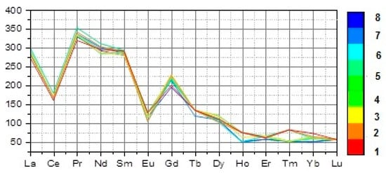 REE distributions in geological samples are controlled by the tetrad behavior on the REE legends; hence, REE representing quarter, half, three-quarters, and fully filled 4f shells have higher stability []. In natural samples, two complimentary types of tetrad effects have been identified: REE in a solid phase exhibit an M-type tetrad effect, whereas REE in a solution exhibit a W-type tetrad effect []. REE-bearing rock-forming minerals, monazite and xenotime, may also display a W-type tetrad effect—rather weak but sufficient for causing an M-type tetrad effect in the remaining melt [,].