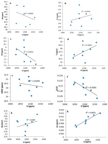 Variation diagrams of U and some trace elements (Figure 7) illustrated that U has a weak positive correlation with Y (Figure 7d) and a strong positive correlation with gold (Figure 7h), while it has a weak to moderate negative correlation with Hf and Zr/U (Figure 5d,f). In addition, uranium has a weakly defined correlation with the other trace elements, indicating a weak to moderate effect of magmatic processes, while the post-magmatic processes or underground water could greatly influence the redistribution of uranium and other elements.